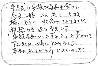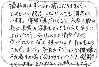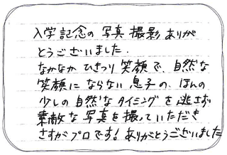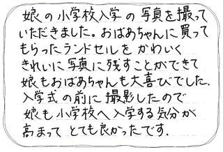 先日、小学校入学の娘の撮影をしました。2年振りの撮影だったので少し不安でしたが、スタッフの方々のおかげで、最後まで笑顔で撮影することが出来ました。