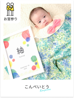 お宮参り撮影をしていただいたお客様は無料で産着レンタルもできますので、