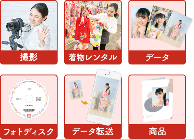 撮影、着物レンタル、データ転送、マリオフォトディスクと選べる商品が全部にパックになって、とってもお得です!!
