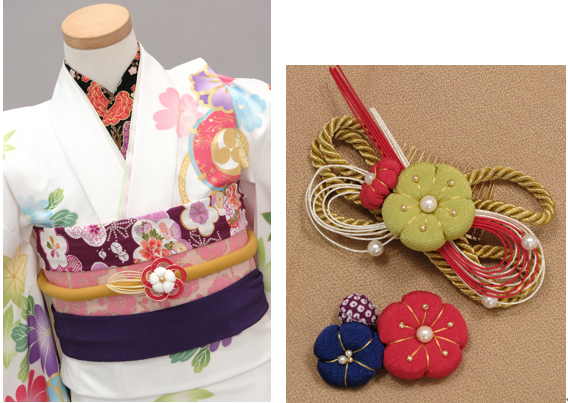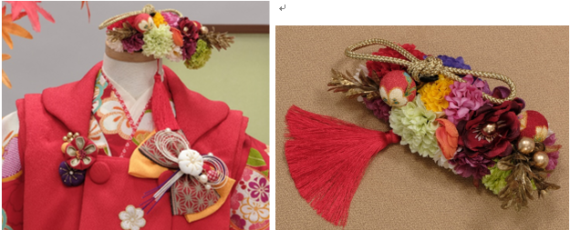 大きな髪飾りで華やかさを一気に出します。被布には水引のリボンをつけることによって小物等の統一感を出します♪
