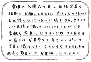 先日、小学校入学の娘の撮影をしました。2年振りの撮影だったので少し不安でしたが、スタッフの方々のおかげで、最後まで笑顔で撮影することが出来ました。